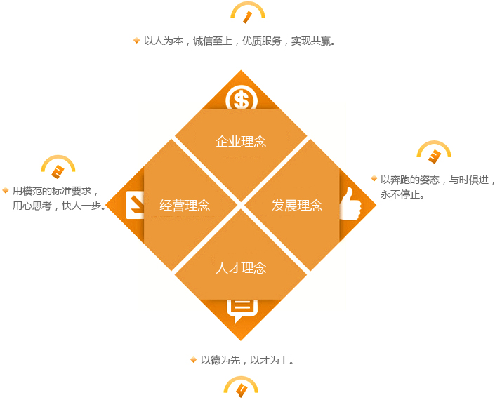回報社會、構筑和諧。服務人民大眾,振興民族經(jīng)濟;質量是企業(yè)的生命;顧客是完美的衣食父母;遵守國家法律,弘揚法制精神,伸張社會正義,爭做守法公民;爭創(chuàng)效益,回報社會;以人為本,以才興企,廣納賢才。