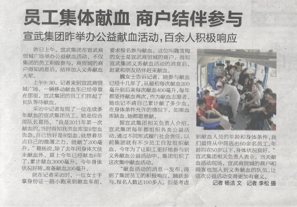 2017年4月22日,《都市晨報》對宣武集團職工無償獻(xiàn)血活動進行報道,彰顯了宣武社會正能量。